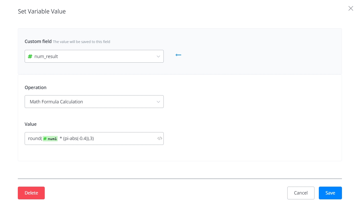 conditionWith this operation, you can now do formula calculation directly in the Action Step - "Set Variable Value" and Condition Step - "Value".Math operations and function supported:+, -, *, e, pi, PI, abs(), min(), max(), ceil(), floor(), log(), pow(), round(), sqrt(), sin(), cos(), tan()If the formula is invalid, the system will return 0 to number variable and empty to text variable.